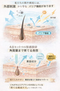 4点セットには、2024年に学会発表された浸透型NMN誘導体(※整肌成分)が採用されています。