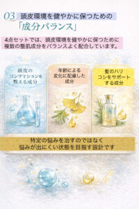 4点セットでは、頭皮環境を健やかに保つために、複数の整肌成分をバランスよく配合しています。