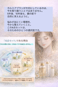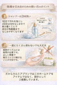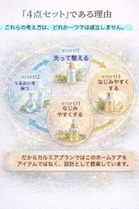 だからカルミアブランでは、このホームケアを「アイテム」ではなく“設計”としてご提案しています。