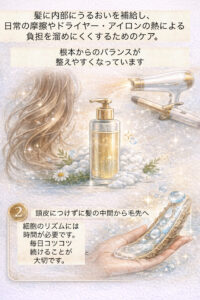 髪の内部にうるおいを補給し、日常の摩擦やドライヤー・アイロンの熱による負担を溜めにくくするためのケア。